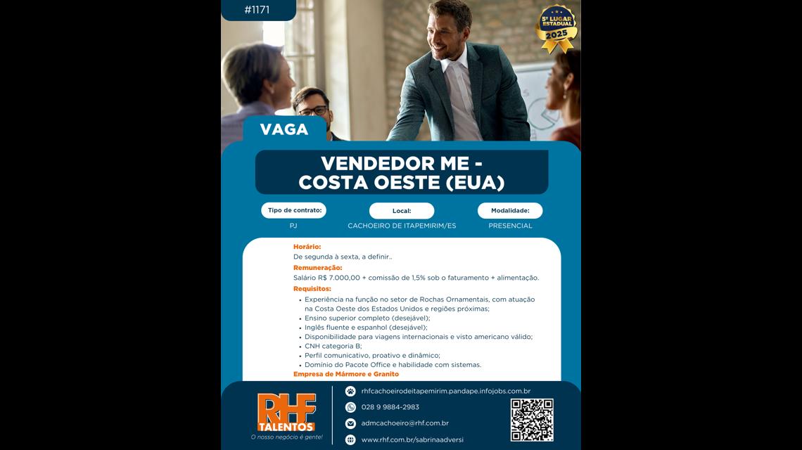 - Atuação em vendas e prospecção no mercado dos Estados Unidos, com foco na região da Costa Oeste e áreas adjacentes, incluindo disponibilidade para viagens ao mercado-alvo.